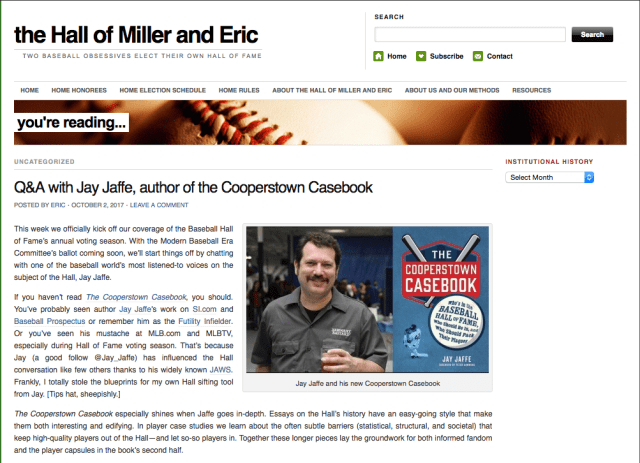 I’d stumbled across The Hall of Miller and Eric a few times over the years, a blog in which two self-described “baseball obsessives” have built their own alternative shrine based on their analysis and methodology, mirroring the size of the actual Hall but doing their level-headed best to get it right. So of course I was down for a Q&A about The Cooperstown Casebook with HOME’s Eric Chalek. A taste: